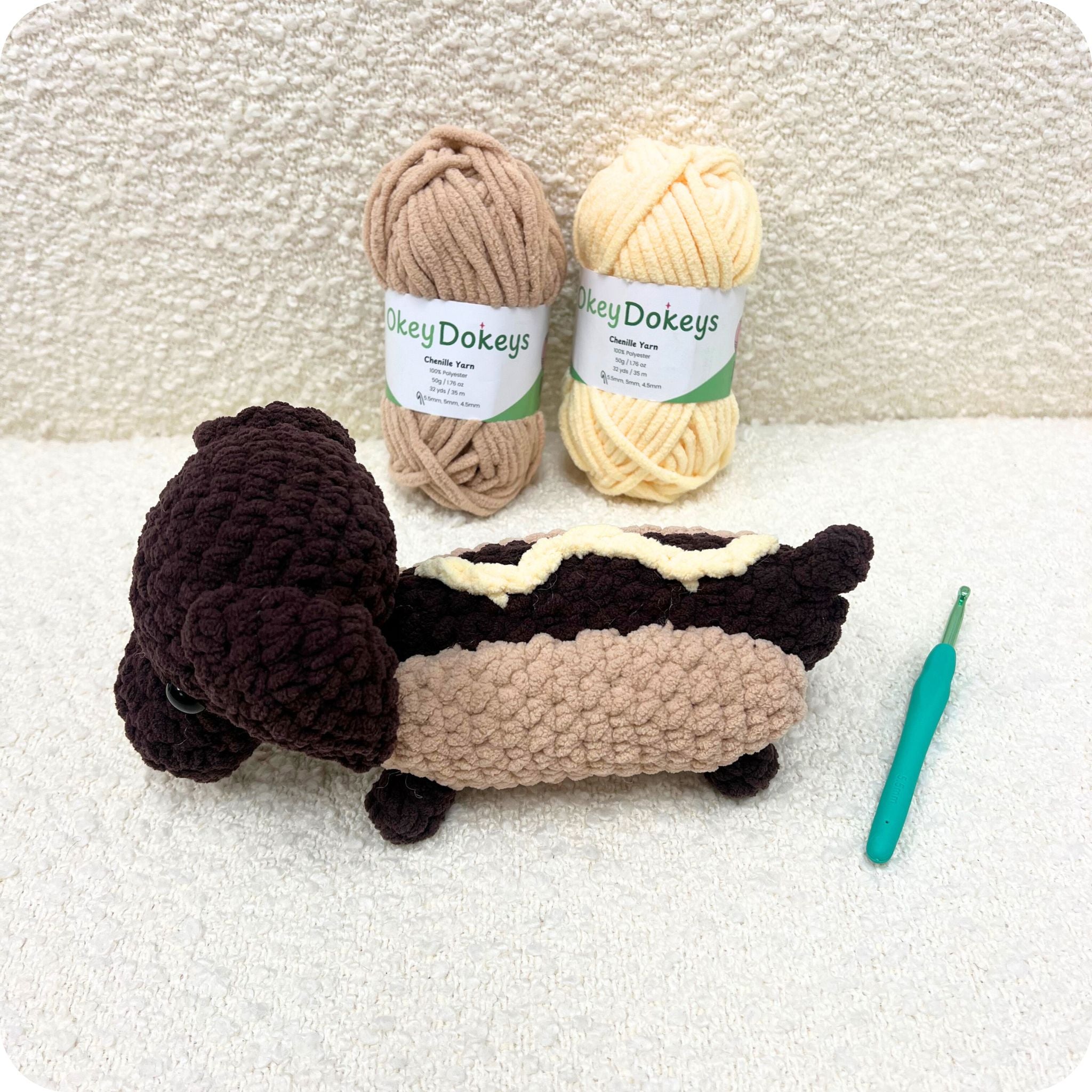 Perfect for gifting, playtime, or just showing off your sense of humor, this hot dog dog is made using soft, super bulky chenille yarn and basic stitches. It’s a quick, rewarding make that’s bound to get smiles.