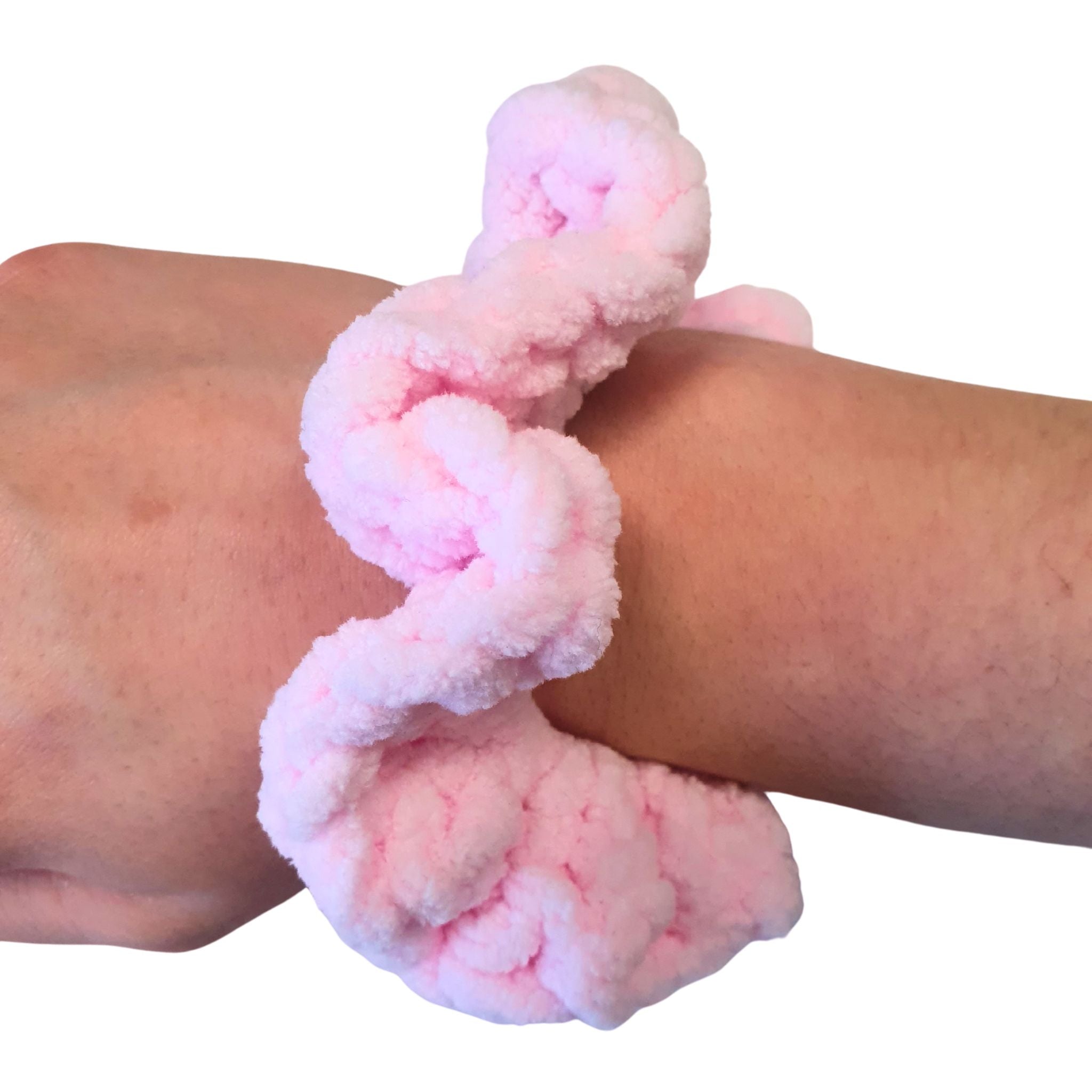 Made with plush chunky chenille yarn, this scrunchie is gentle on hair while providing a comfortable and stylish hold. The pattern is simple, featuring basic stitches to create a fluffy, full scrunchie with a soft texture.
