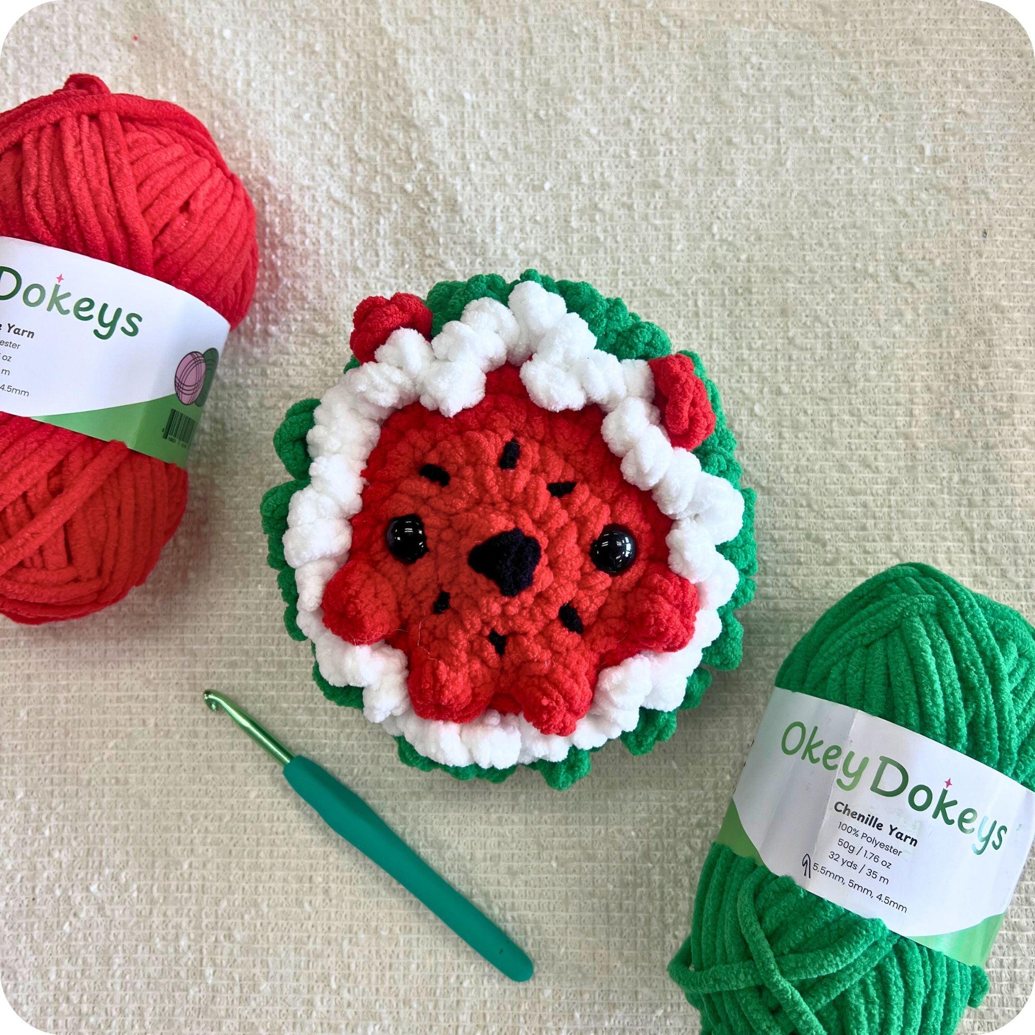 Made with soft super bulky chenille yarn, this project is quick, easy, and full of charm. From the bright red body to the leafy green accents, this little hedgie is as squishy as it is unique.