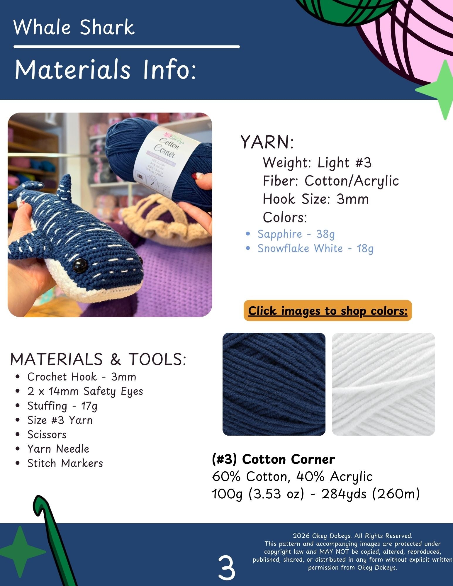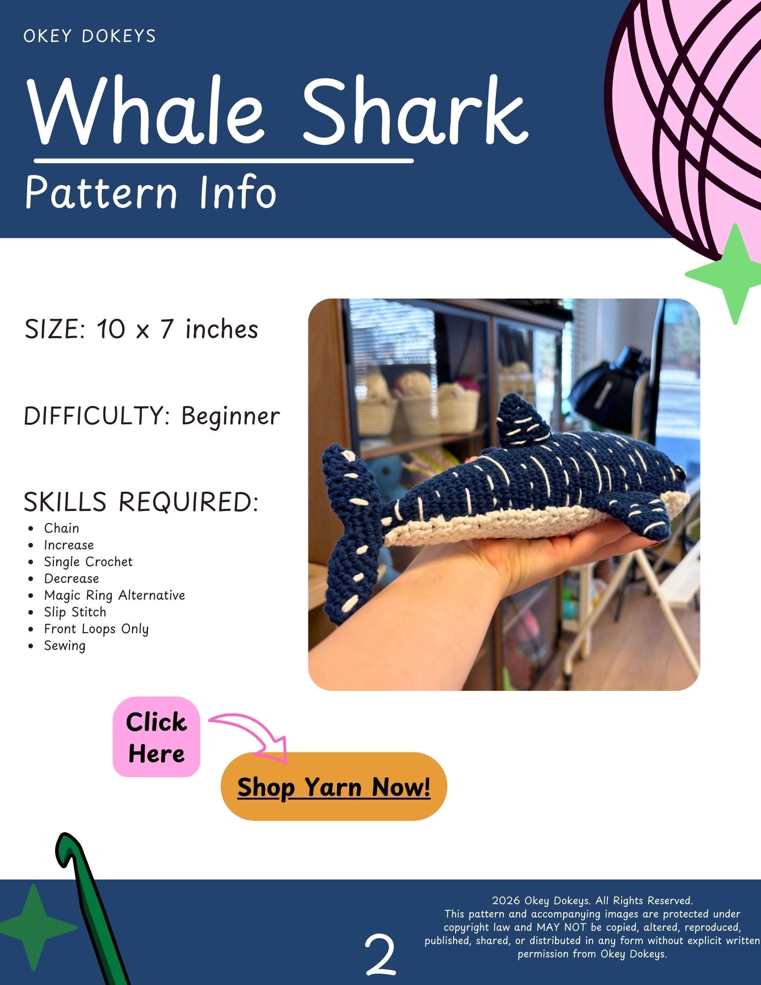 Both the Yarn Option and Supplies Option include full skeins of yarn, giving you enough to make 2 of these beginner crochet whale sharks from a single purchase.