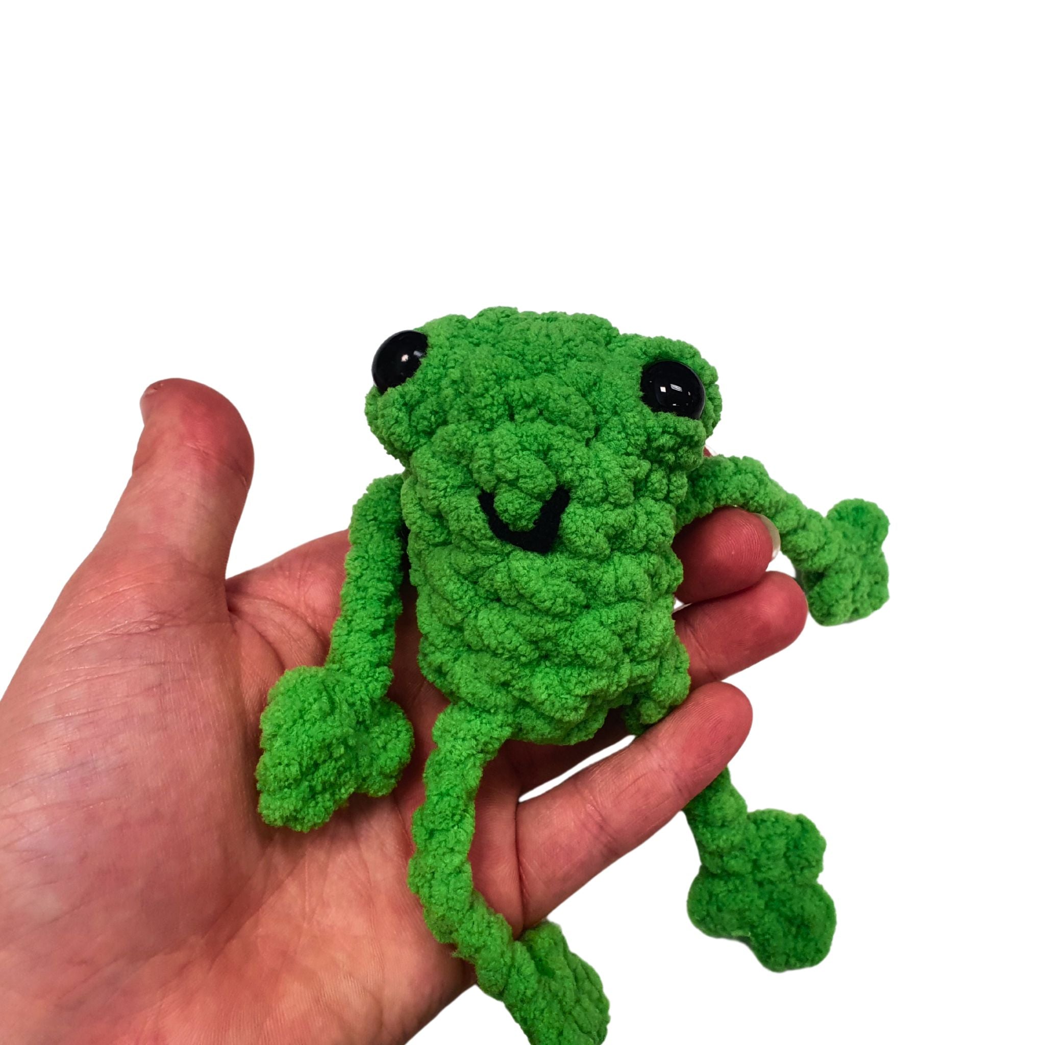 Start crocheting your own leggy frog today! This quick and fun pattern is perfect for beginners looking to try textured stitches and create a squishy, lovable frog friend.